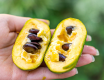 Fruits have a thin skin, which contain a yellow custard-like pulp that is said to taste like papaya